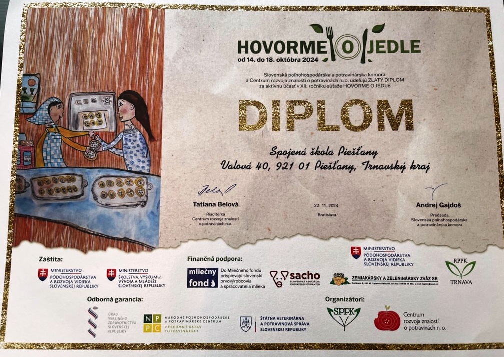 V XII.ročníku súťažno - vzdelávacej aktivity "Hovorme o jedle " sme boli opäť úspešní . Získali sme Zlatý diplom.Cieľom súťaže je vyvolávať a podporovať spoluprácu a aktívnu účasť školy pri vzdelávaní detí a mládeže o potravinách a dobrých stravovacích návykoch ako súčasti zdravého životného štýlu, o úlohe potravín pri ochrane zdravia a ich význame pre tvorbu a ochranu životného prostredia, regionálny rozvoj a zamestnanosť.Súťaž je určená pre všetky základné školy so sídlom v SR.Hľadajú sa kreatívne a inovatívne nápady na vzdelávanie v oblasti potravín a výživy.